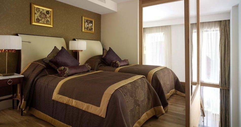 Dolmabahçe Deluxe Suite. Количество 16, из них 2 номера для людей с ограниченными физическими возможностями. Площадь 51 м2: однoкомнатный номер, разделенный на две части аркой (двери нет), место для отдыха (софа), телевизор и рабочий стол, спальня (1 king size bed), место для отдыха (небольшая софа) и гардероб, ванная комната (ванна с душем и туалет), шкаф в прихожей, балкон (в номерах, расположенных на четвертом этаже вместо балкона – терраса), макс. 3+1 чел.