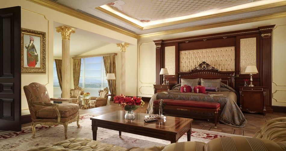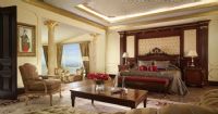 Royal Suite. Количество 2. Площадь 600 м2: находятся на восьмом этаже, пятикомнатный номер, коридор, небольшая кухня,рабочий кабинет, просторная гостиная комната (98 кв.м.) с мягкой мебелью и обеденным столом, 2 Спальни (в двух спальнях - king size bed). В первой спальне имеется место для отдыха (мягкая мебель), телевизор, гардеробная и ванная комната (сауна, душевая кабина, туалет и биде). Во второй спальне - место для отдыха, телевизор, гардероб, ванная комната (ванна с джакузи, душевая кабина, туалет и биде). 2 Террасы (80 кв.м.). Одна терраса с видом на горы; вторая – с видом на бассейн. На второй террасе имеется неглубокий бассейн с гидромассажем., макс. 5+1 чел.