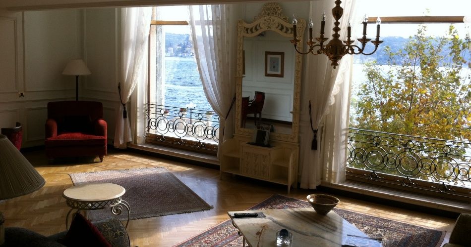 Lale suite (140 кв. м): балкон, гостиная с обеденной зоной (стол на 4 персоны) и мини-кухней, ванная комната с ванной и душевой кабиной «тропический дождь», гостевой туалет. Вид на Босфор. Расположены в главном здании.