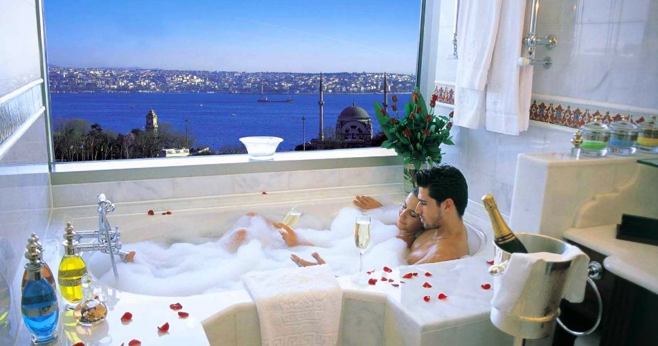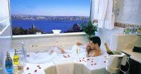 Front Bosphorus view deluxe room (45-50 кв. м): спальня с кроватью king-size, ванная комната с ванной и душевой кабиной. Прямой вид на Босфор.