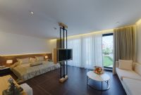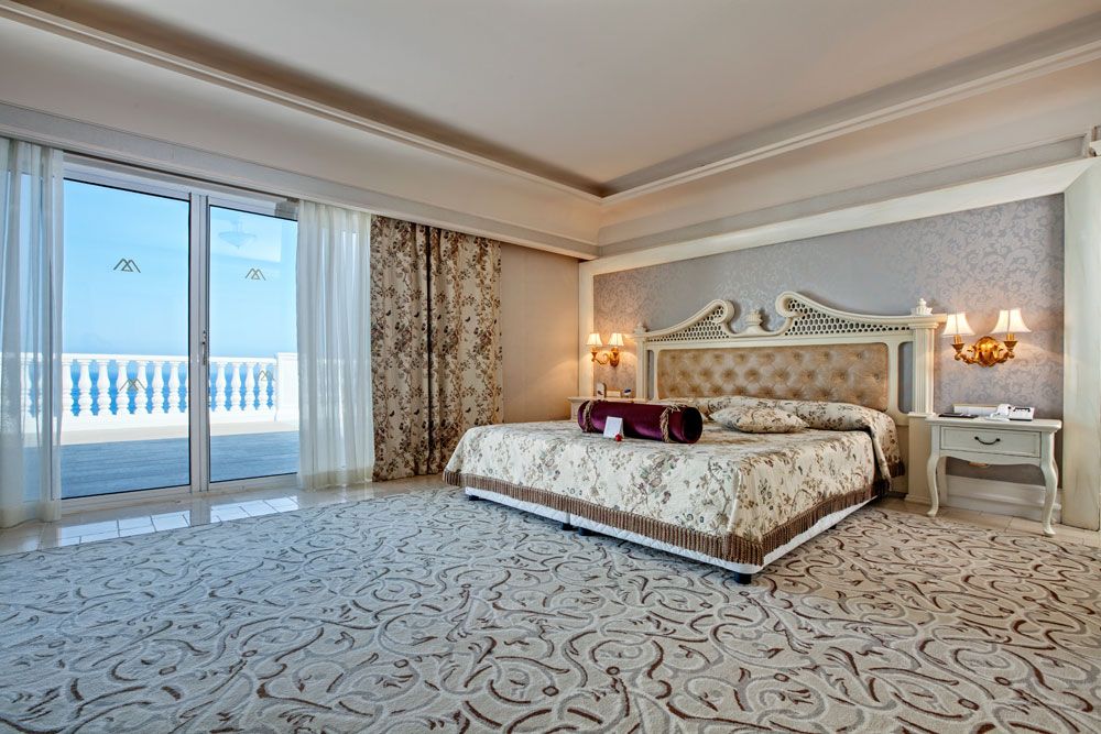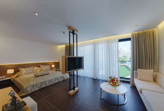 Deluxe: 273 deluxe standard room (макс. 3 чел., 40 м2); 5 двухкомнатных deluxe family room (2 спальни, одна c дверью, 2 тв, макс. 4 чел., 70 м2); 17 двухкомнатных deluxe junior suite (1 спальня с french bed, 1 гостиная комната 2 тв, макс. 3 чел., 63 м2); 7 двухкомнатных suite deluxe (спальня , гостиная с мягкой мебелью и столом, в некоторых номерах американская кухня, рабочий кабинет, ванная с ванной и душем, 2 тв, макс. 3 чел, 80 м2), с террасой; 2 трехкомнатных Suite major (2 спальни с french bed , с дверью, гостиная с мягкой мебелью и столом, в одном из номеров американская кухня, рабочий кабинет, 3 тв, 2 ванныe, одна из них с джакузи, другая с душем, гардеробная комната, терраса 75 м2, оборудованная зонтиками, шезлонгами и столиком, макс. 4 чел., 175 м2, VIP-сервис).