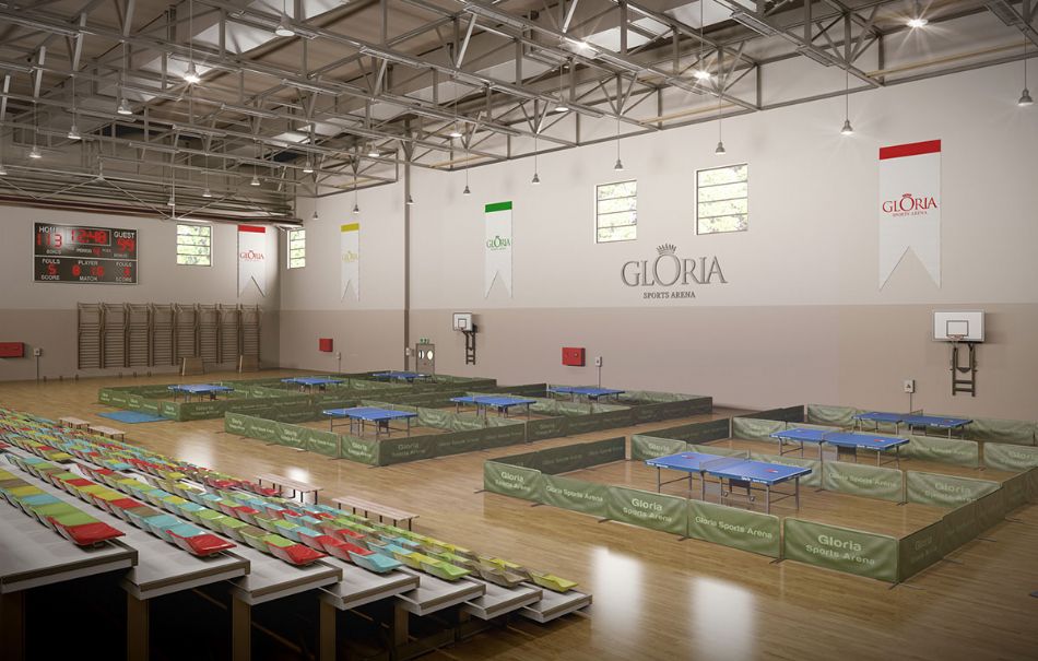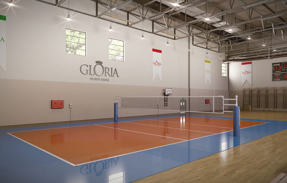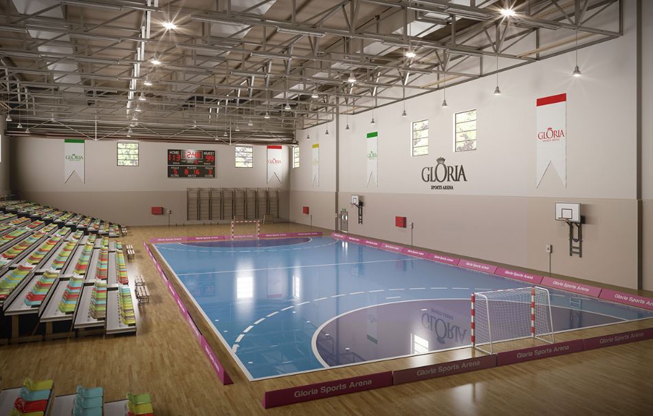 Комплекс Gloria Sports Arena располагает крытыми объектами площадью 6 800 м2 , среди которых многофункциональный спортивный зал с телескопическими трибунами. Спортивный зал можно разделить на 4 поля. В комплексе расположено также множество спортивных помещений различного назначения.