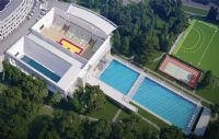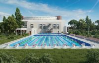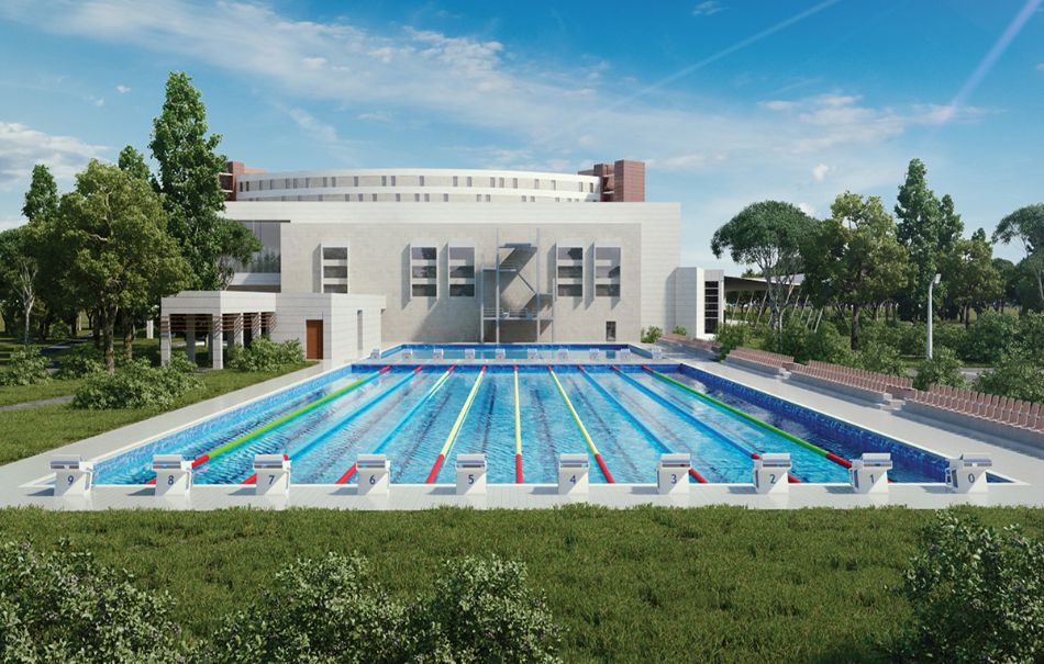 Бассейны для плавания. Открытый олимпийский бассейн на 10 дорожек, построенный в соответствии со стандартами Международной федерации плавания, оснащенный системами хронометража Omega и стартовыми блоками OSB11 c фиксацией фальстарта. Крытый олимпийский бассейн на 5 дорожек, оснащенный системами хронометража Omega и стартовыми блоками OSB11 c фиксацией фальстарта. Открытый бассейн для плавания на «короткой воде» на 6 дорожек, построенный в соответствии со стандартами Международной федерации плавания, оснащенный системами хронометража Omega и стартовыми блоками OSB11 c фиксацией фальстарта.