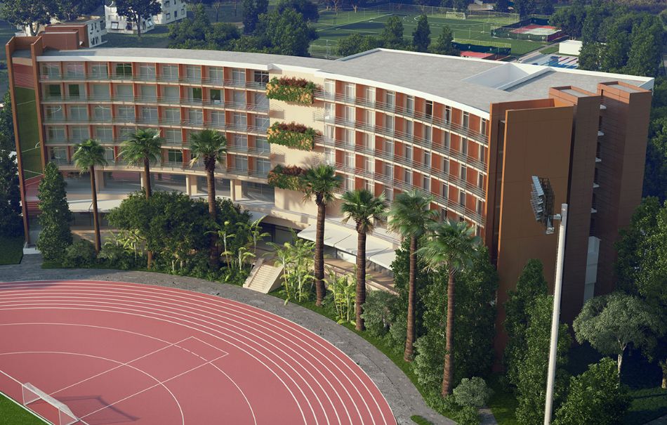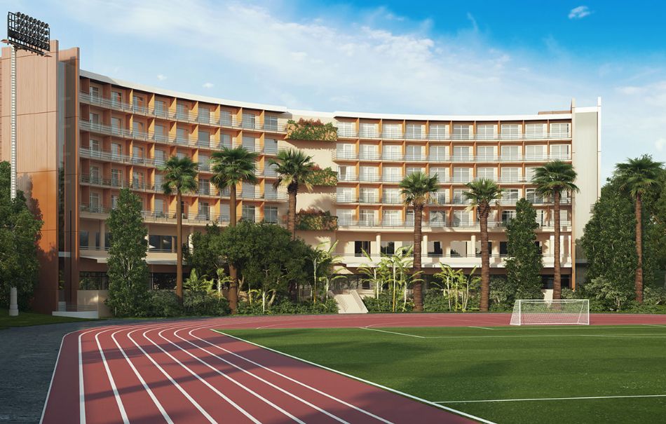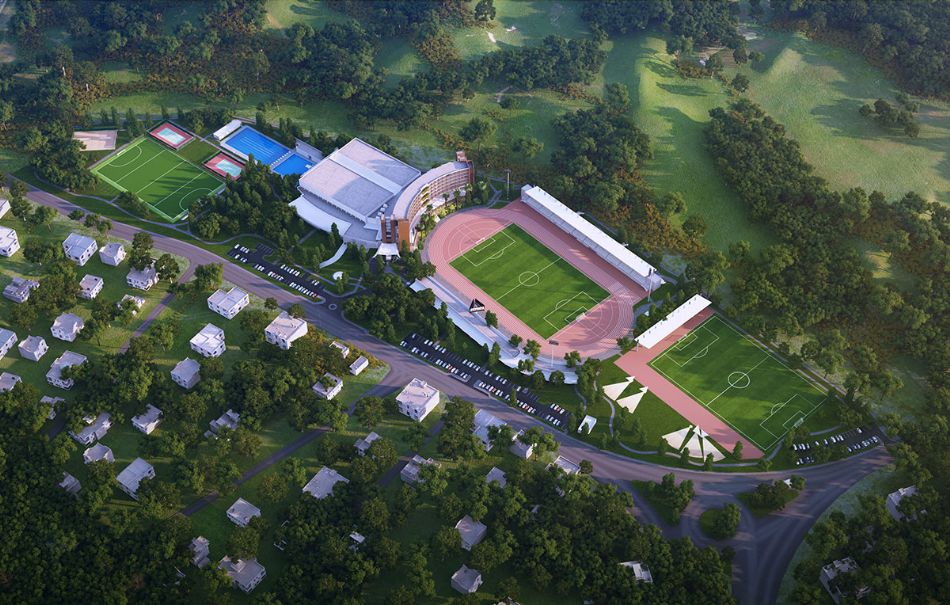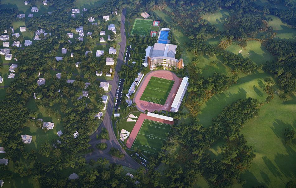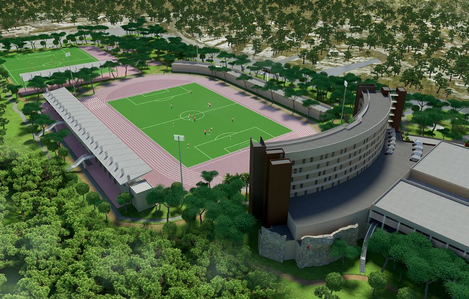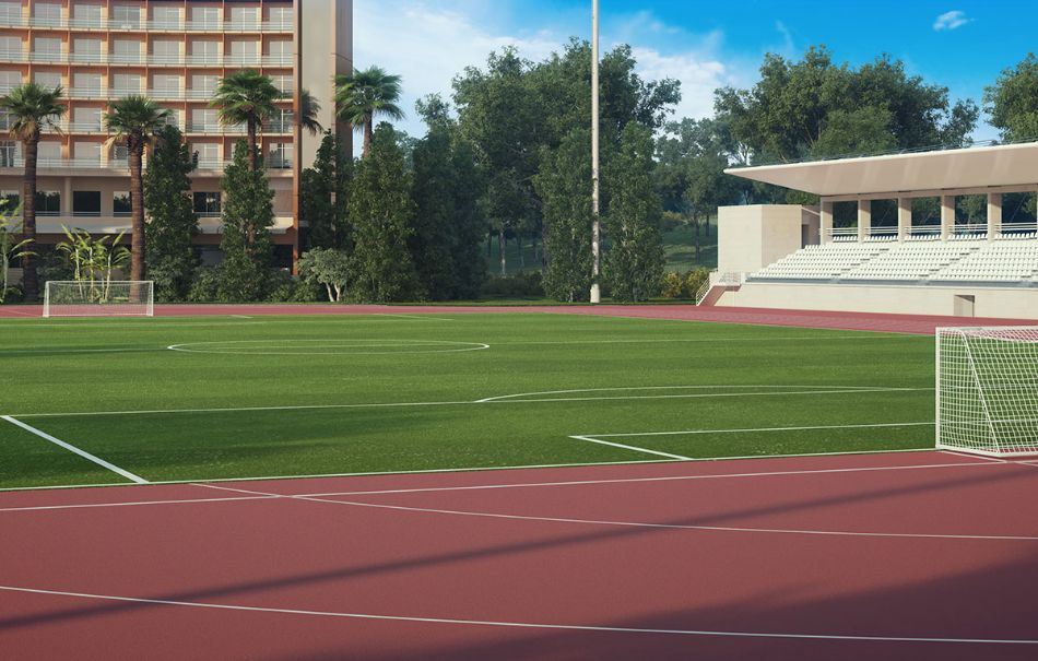 Открытые объекты площадью 35 000 м2 включают стадион на 1 600 зрителей и различные спортивные поля.