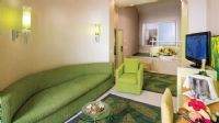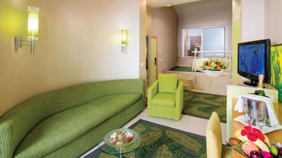 Villa Junior Suite. Количество 80. Площадь 50 м2: гостиная, спальня без двери, ванная комната с джакузи и душем, пол – керамическая плитка, с прямым выходом к бассейну, к услугам гостей – отдельный ресторан (завтрак, обед) и бар в течение дня, макс. 2+2 чел.