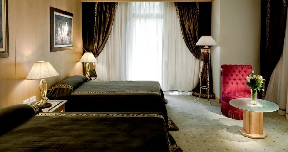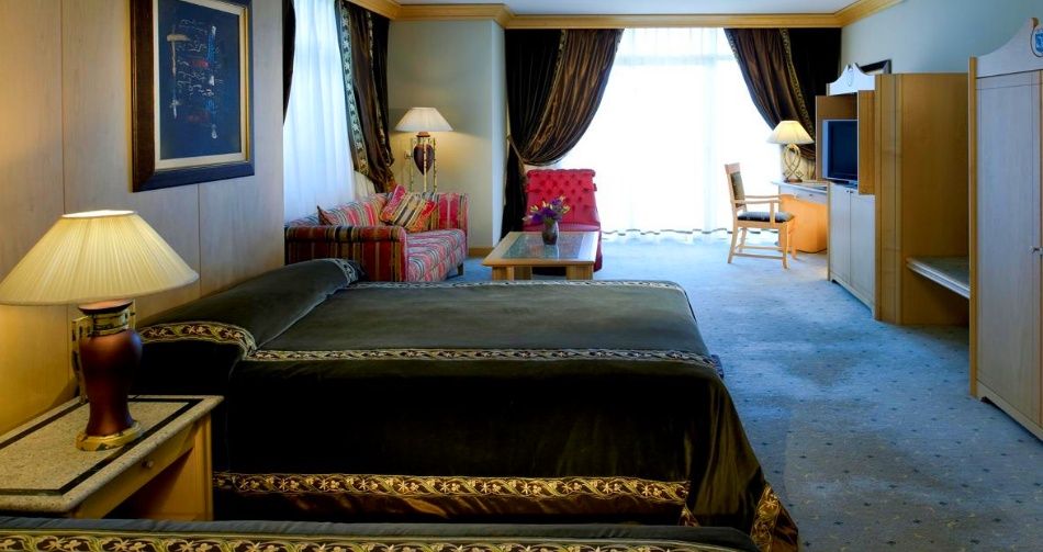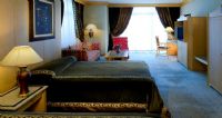 King Suite. Количество 2. Площадь 88 м2: В главном здании отеля на четвертом или пятом этажах , с видом на сад. Номера состоят из гостиной и двух спален. В гостиной комнате находится мягкая мебель, телевизор LCD 42'', обеденный стол на 6 чел., рабочий стол, балкон со столом и стульями. Одна спальня с french bed, кресло, другая спальня с 2 twin beds, мягкий уголок. Cпальни c телевизором LCD 32'', ванные комнаты с джакузи и душем, межкомнатные двери, балконы со столом и стульями. Покрытие пола – ковролин, макс. 4+1 чел. VIP-сервис.